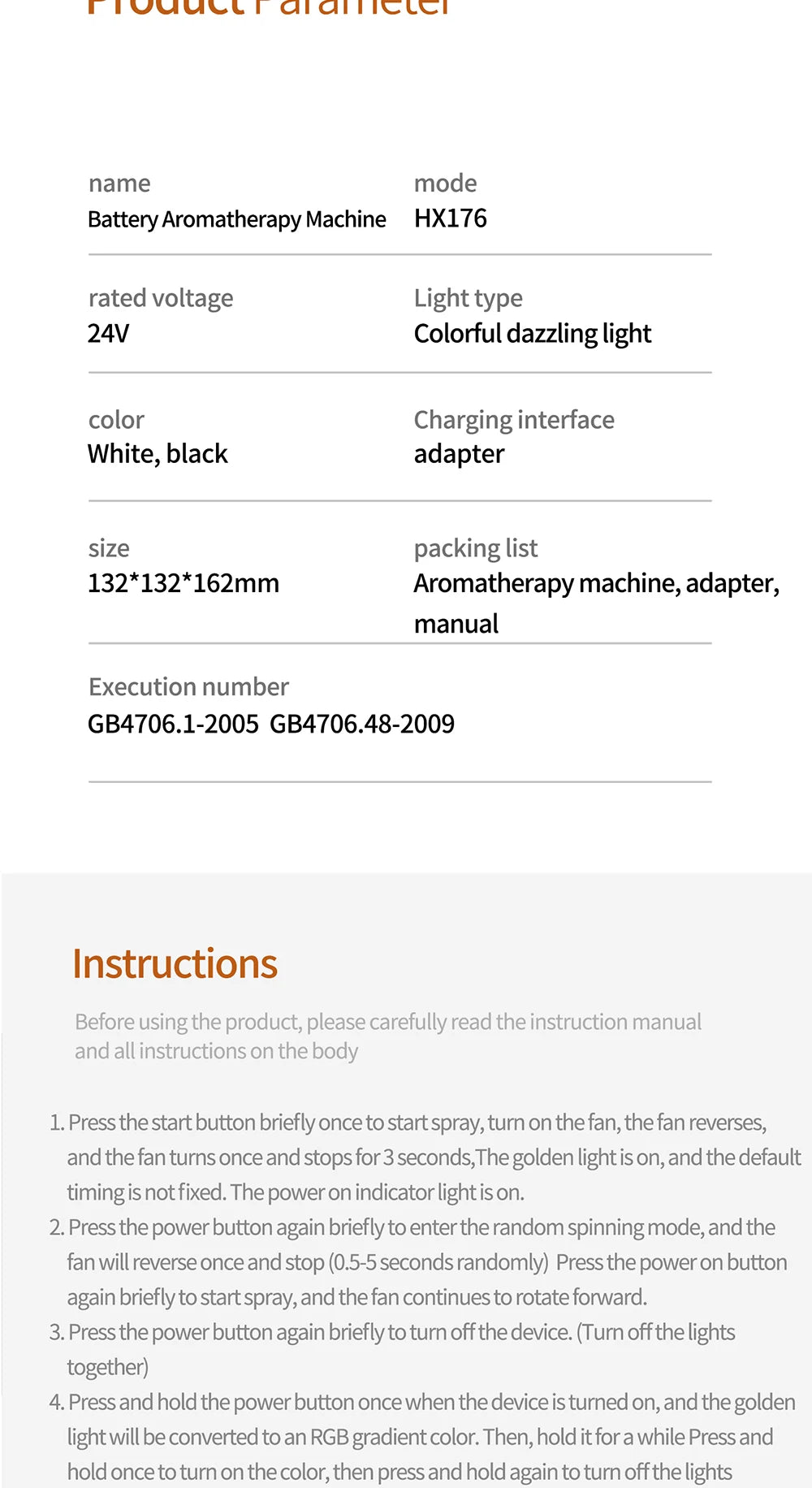 1, Click the power on button once to start spray, turn on the fan, and the fan reverses. The fan turns and stops for 3 seconds. The golden light is on, and the power on indicator is on.